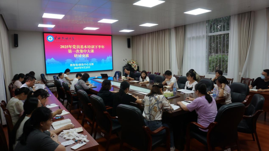 为深入学习贯彻党的创新理论,巩固拓展学习教育成果,9月25日下午,教务处/教师教学发展中心党支部在博雅楼119会议室举行2025年党员基本培训下半年第一次集中大课的学习心得交流研讨活动。党支部全体党员积极参会,支部书记刘银妹主持会议。
